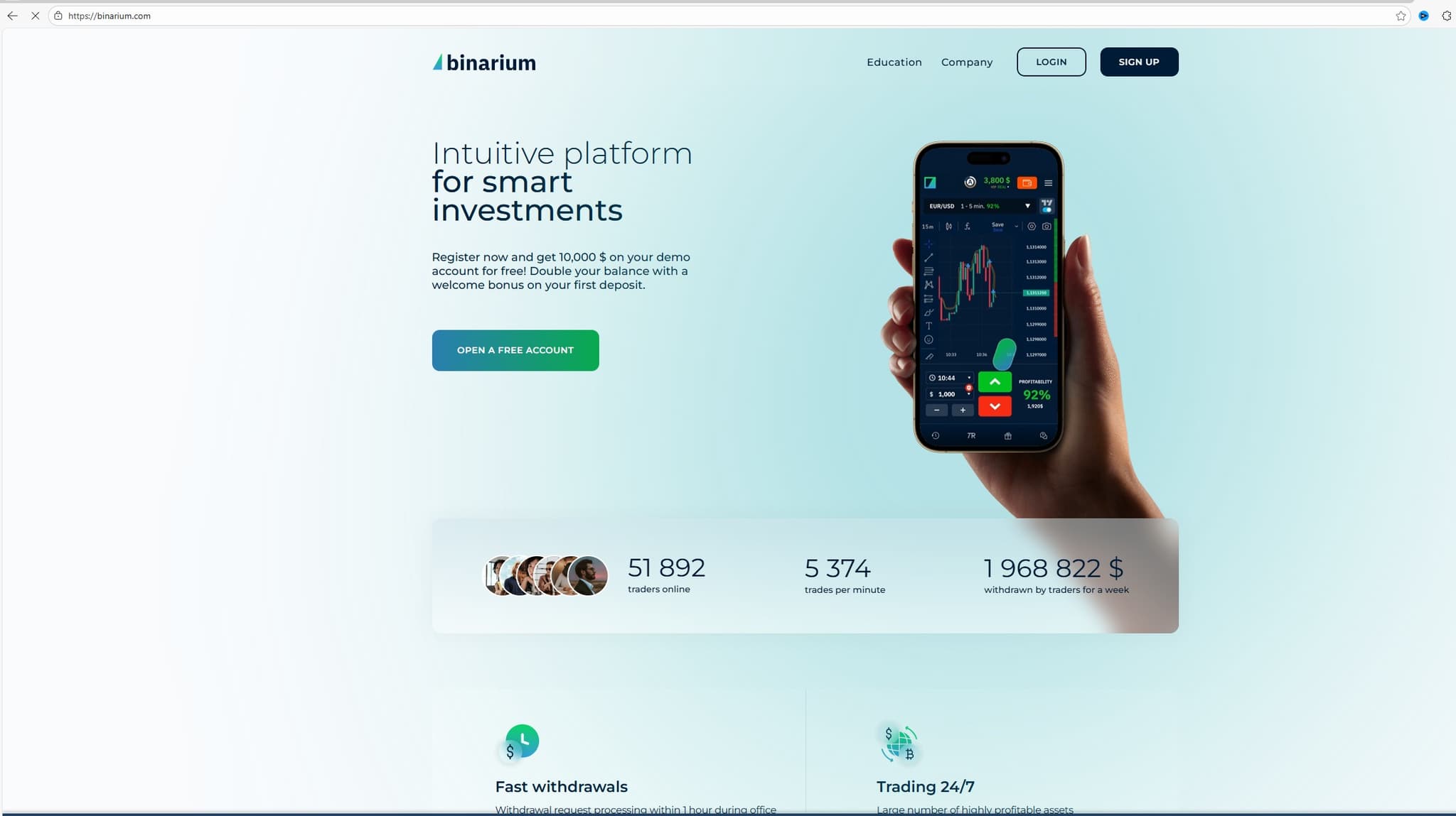 Binarium est un vétéran du marché qui opère depuis 2012. Alors que la plupart des concurrents ont quitté le marché russe ou ont déménagé dans d'autres pays, Binarium est resté fidèle à l'auditoire de la CEI. Cela se reflète dans l'interface en langue russe, le support, le matériel éducatif et même le système de commerce intégré.